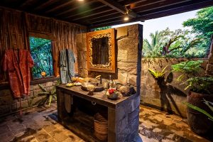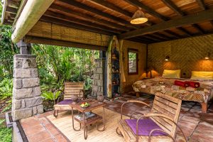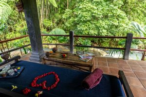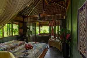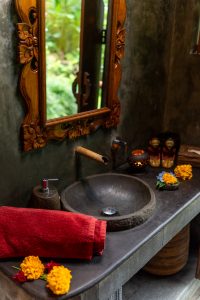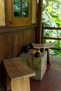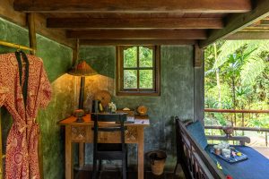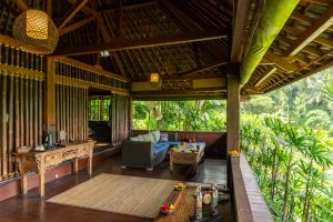The bedroom is equipped with a queen bed, comfortable daybed for lounging and private bathroom to the side. From the privacy of your bungalow, enjoy your own changing views with adjustable bamboo blinds, or take some time out in the sitting area beneath where you can read or lie back and enjoy tranquil views of the stream and surrounding forest. If you wish to indulge in some creative inspiration while here in Bali, a wooden writing desk is positioned at the front of the bungalow so you can overlook sweeping views of the jungle.
