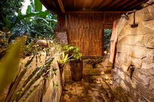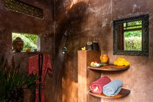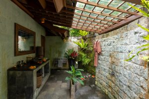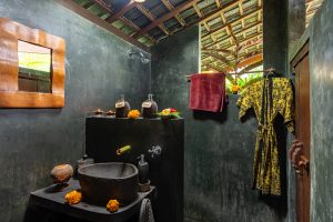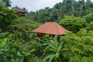 With two separate bedrooms, a shared jungle bathroom decorated with wild orchids and a large common area, you can relax with family or friends without compromising on privacy. From the comfort of the lounge area, relax on two large daybeds while enjoying sweeping views of rice paddies, jungle food forests and even the distant view of the sea, or soak up some sun in the enclosed private garden. The first bedroom is equipped with a queen bed, while the second bedroom includes two single beds, which can be converted to a king bed. With adjustable bamboo blinds you have the choice to sleep under twinkling stars and the moon while being lulled to sleep to the chorus of rushing water and frogs. It’s the perfect accommodation for those wanting to experience untouched nature in central Bali.