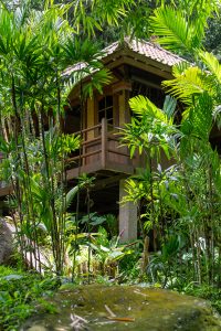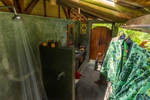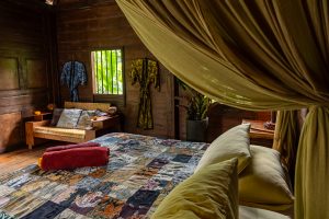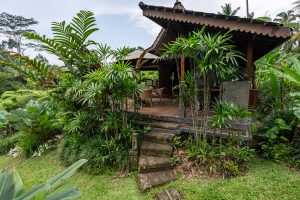 Perched on its hillside, this bungalow offers panoramic and ever-changing vistas of our jungle food forest and rice paddies. This is a view you will never forget and which you can enjoy for hours from your private daybed. The bedroom is equipped with a queen bed and lounge area with daybed. A spacious and romantic bathroom is positioned below the bungalow with its own little tropical garden, and two private sun beds for some downtime and sun bathing.